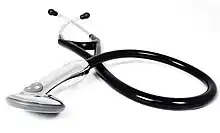 A Doppler stethoscope is an electronic device that measures the Doppler effect of ultrasound waves reflected from organs within the body. Motion is detected by the change in frequency, due to the Doppler effect, of the reflected waves. Hence the Doppler stethoscope is particularly suited to deal with moving objects such as a beating heart.[28] It was recently demonstrated that continuous Doppler enables the auscultation of valvular movements and blood flow sounds that are undetected during cardiac examination with a stethoscope in adults. The Doppler auscultation presented a sensitivity of 84% for the detection of aortic regurgitations while classic stethoscope auscultation presented a sensitivity of 58%. Moreover, Doppler auscultation was superior in the detection of impaired ventricular relaxation. Since the physics of Doppler auscultation and classic auscultation are different, it has been suggested that both methods could complement each other.[29][30] A military noise-immune Doppler based stethoscope has recently been developed for auscultation of patients in loud sound environments (up to 110 dB).