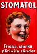 Stomatol is a brand of toothpaste first sold in Sweden at the beginning of the 20th century. It was particularly notable as having been one of the first Swedish brands to recognise and to use the power of mass media. The brand was originally made by the soap manufacturer Grumme & Son, acquired 1985 by pharmaceutical company Cederroth AB. The company made extensive use of press, film and signs, both enamel and neon.