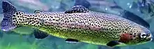 S. iniae is highly pathogenic in freshwater, marine, and euryhaline fish, and is highly lethal: outbreaks may be associated with 30–50% mortality.[26] It is, therefore, one of the foremost economically important pathogens in intensive aquaculture.[27][28] In 1997, the global economic impact of S. iniae infection to the aquaculture industry was estimated at US$100 million (one-tenth of which in the United States).[27] As of 2007, infection had been reported in 27 species of fish, including tilapia (genus Oreochromis and Tilapia), rainbow trout (Oncorhynchus mykiss), coho salmon (Oncorhynchus kisutch), Japanese amberjack (Seriola quinqueradiata), red drum (Sciaenops ocellatus), and barramundi (Lates calcarifer, which can be an asymptomatic carrier).[14][15][29] Common carp (Cyprinus carpio), channel catfish (Ictalurus punctatus), and goldfish (Carassius auratus) appear to be resistant.[27] Fish raised in intensive aquaculture operations and subject to environmental stressors (i.e. suboptimal temperature, poor water quality, crowding, handling, etc.) are most prone to S. iniae infection.[30][31][32][33][34] Wild fish populations located both near[10][35] and far from[36] aquaculture operations have also proven susceptible to S. iniae infection.