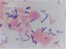 S. pyogenes is the cause of many human diseases, ranging from mild superficial skin infections to life-threatening systemic diseases.[2] Infections typically begin in the throat or skin. The most striking sign is a strawberry-like rash. Examples of mild S. pyogenes infections include pharyngitis (strep throat) and localized skin infection (impetigo). Erysipelas and cellulitis are characterized by multiplication and lateral spread of S. pyogenes in deep layers of the skin. S. pyogenes invasion and multiplication in the fascia can lead to necrotizing fasciitis, a life-threatening condition which requires prompt surgical intervention to reduce morbidity and mortality.[32][33] The bacterium is found in neonatal infections.[34]