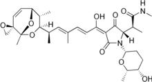 Streptolydigin (Stl) is an antibiotic that works by inhibiting nucleic acid chain elongation by binding to RNA polymerase, thus inhibiting RNA synthesis inside a cell.[1][2][3] Streptolydigin inhibits bacterial RNA polymerase, but not eukaryotic RNA polymerase.[4] It has antibacterial activity against a number of Gram positive bacteria.