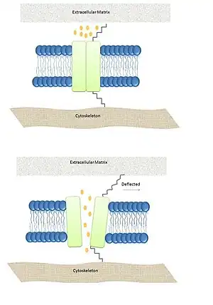 Two different mechanisms have been found to open stretch-activated ion channels: Mechanical deformations in the cell membrane can increase the probability of the channels opening. Proteins of the extracellular matrix and cytoskeleton are tethered to extra - and intra-cytoplasmic domains, respectively, of the stretch-activated ion channels. Tension on these mechanosensory proteins causes these proteins to act as a signaling intermediate, resulting in the opening of the ion channel.[55] All known stretch-activated ion channels in prokaryotic cells have been found to be opened by direct deformation of the lipid bilayer membrane.[57] Channels that have been shown to exclusively use this mechanism of gating are the TREK-1 and TRAAK channels. In studies using mammalian hair cells, the mechanism that pulls on proteins tethered from the intra- and extra-cytoplasmic domain of the channel to the cytoskeleton and extracellular matrix, respectively, is the most likely model for ion channel opening.[57]