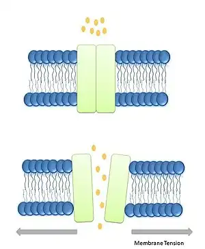 All organisms, and apparently all cell types, sense and respond to mechanical stimuli.[8] MSCs function as mechanotransducers capable of generating both electrical and ion flux signals as a response to external or internal[9] stimuli.[10] Under extreme turgor in bacteria, non selective MSCs such as MSCL and MSCS serve as safety valves to prevent lysis. In specialized cells of the higher organisms, other types of MSCs are probably the basis of the senses of hearing and touch and sense the stress needed for muscular coordination. However, none of these channels have been cloned. MSCs also allow plants to distinguish up from down by sensing the force of gravity. MSCs are not pressure-sensitive, but sensitive to local stress, most likely tension in the surrounding lipid bilayer.[11]