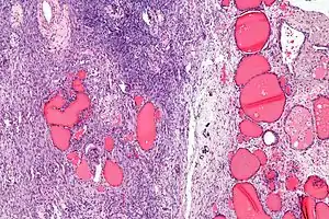 | Micrograph of a struma ovarii. Characteristic thyroid follicles are seen on the right, and ovarian stroma on the left. H&E stain. | |