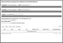 The resulting table has seven columns: the file names for both files used in the calculation, the calculated Dice similarity coefficient, the calculated Hausdorff distance, the calculated directed HD for both directions and the information if image spacing was used in the calculation. The table can be sorted, is searchable and can be exported as a simple copy, an Excel spreadsheet, a comma-separated values file or as a portable document format.