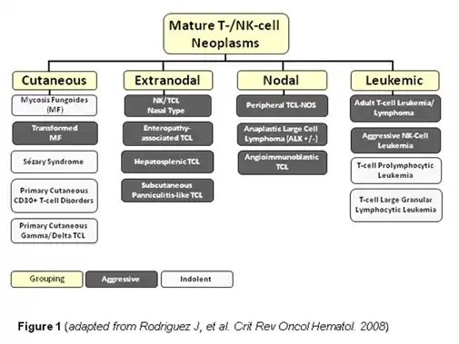 Subcutaneous panniculitis-like T-cell lymphoma, is a subtype of Peripheral T-cell lymphoma. Peripheral T-cell lymphoma (PTCL) is defined as a diverse group of aggressive lymphomas that develop from mature-stage white blood cells called T-cells and natural killer cells (NK cells) (see figure for an overview of PTCL subtypes). PTCL is a type of non-Hodgkin’s lymphoma (NHL).[2] NHL affects two particular types of white blood cells: B-cells and T-cells. PTCL specifically affects T-cells, and results when T-cells develop and grow abnormally.