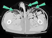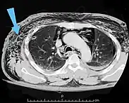| An abdominal CT scan of a patient with subcutaneous emphysema (arrows) | |