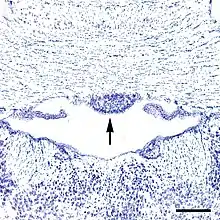 The subfornical organ (SFO) is one of the circumventricular organs of the brain.[1][2] Its name comes from its location on the ventral surface of the fornix near the interventricular foramina (foramina of Monro), which interconnect the lateral ventricles and the third ventricle. Like all circumventricular organs, the subfornical organ is well-vascularized, and like all circumventricular organs except the subcommissural organ, some SFO capillaries have fenestrations, which increase capillary permeability.[1][3][4] The SFO is considered a sensory circumventricular organ because it is responsive to a wide variety of hormones and neurotransmitters, as opposed to secretory circumventricular organs, which are specialized in the release of certain substances.[1][4][5]