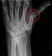 X-ray showing metacarpophalangeal subluxation of the thumb of a 71-years old woman due to trapeziometacarpal osteoarthritis