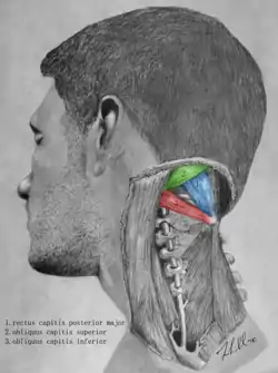 ![]() Artist depiction of the muscles that border the suboccipital triangle. | |