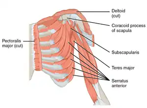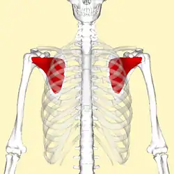 ![]() Subscapularis muscle (in red). Ribs are shown as semi-transparent. | |
