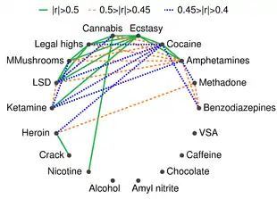 This diagram depicts the correlations among the usage of 18 legal and illegal drugs: alcohol, amphetamines, amyl nitrite, benzodiazepines, cannabis, chocolate, cocaine, caffeine, crack, ecstasy, heroin, ketamine, legal highs, LSD, methadone, magic mushrooms (MMushrooms), nicotine and volatile substance abuse (VSA). Usage is defined as having used the drug at least once during years 2005–2015. The colored links between drugs indicate the correlations with |r|>0.4, where |r| is the absolute value of the Pearson correlation coefficient.[11]