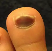 Repeatedly thrusting the toes against a shoe's toe box can cause a subungual hematoma called jogger's toe,[8] runner's toe, or black toenail. In a marathon, several percent of runners may be affected.[4] Wearing footwear which fits helps prevent runner's toe.[4]