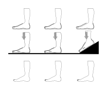 If the shoe is too loose on the midfoot, the foot can slide forwards in the shoe, especially when going downhill. This may jam the toes into the end of the toebox.[4] If the foot is sliding forwards because the shoe is too loose around the midfoot, it may be restrained by lacing the shoe carefully, or placing bulky padding between the tongue and the lacing, or by wrapping a strap in a figure-eight around the foot and ankle (image).[7]: 86–87, 128, 142 Excessively tight or uneven fit around the midfoot may, however, cause tendon problems.[7]: 125