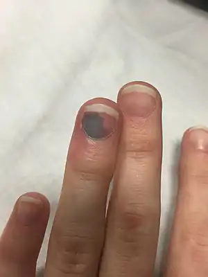 A laceration of the nail bed causes bleeding into the constricted area underneath the hard nail plate.[1] The blood pools under the nail, giving a reddish, brownish, blueish, or grey/blackish discoloration. The blood puts pressure to the nailbed causing pain which can be throbbing in quality and disappears when the pressure on the nail bed is relieved.[2]
