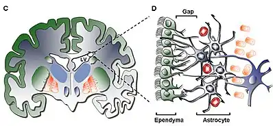 While it has yet to have been studied in-depth in the human brain, the SVZ function in the rodent brain has been, to a certain extent, examined and defined for its abilities. With such research, it has been found that the dual-functioning astrocyte is the dominant cell in the rodent SVZ; this astrocyte acts as not only a neuronal stem cell, but also as a supporting cell that promotes neurogenesis through interaction with other cells.[8] This function is also induced by microglia and endothelial cells that interact cooperatively with neuronal stem cells to promote neurogenesis in vitro, as well as extracellular matrix components such as tenascin-C (helps define boundaries for interaction) and Lewis X (binds growth and signaling factors to neural precursors).[14] The human SVZ is different, however, from the rodent SVZ in two distinct ways; the first is that the astrocytes of humans are not in close juxtaposition to the ependymal layer, rather separated by a layer lacking cell bodies; the second is that the human SVZ lacks chains of migrating neuroblasts seen in rodent SVZ, in turn providing for a lesser number of neuronal cells in the human than the rodent.[2] For this reason, while rodent SVZ proves as a valuable source of information regarding the SVZ and its structure-to-function relationship, the human model will prove significantly different.