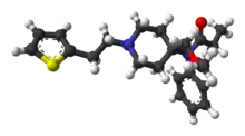 Sufentanil, sold under the brand names Dsuvia and Sufenta, is a synthetic opioid analgesic drug approximately 5 to 10 times as potent as its parent drug, fentanyl, and 500 times as potent as morphine. Structurally, sufentanil differs from fentanyl through the addition of a methoxymethyl group on the piperidine ring (which increases potency but is believed to reduce duration of action[2]), and the replacement of the phenyl ring by thiophene. Sufentanil first was synthesized at Janssen Pharmaceutica in 1974.[3]