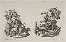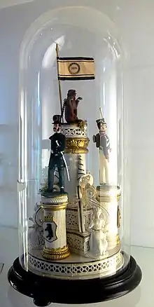 A feast given in Tours in 1457 by Gaston de Foix, which is "probably the best and most complete account we have of a late medieval banquet" includes the first mention of sugar sculptures, as the final food brought in was "a heraldic menagerie sculpted in sugar: lions, stags, monkeys ... each holding in paw or beak the arms of the Hungarian king".[32] Other recorded grand feasts in the decades following included similar pieces.[33] Originally the sculptures seem to have been eaten in the meal, but later they become merely table decorations, the most elaborate called triomfi. Several significant sculptors are known to have produced them; in some cases their preliminary drawings survive. Early ones were in brown sugar, partly cast in molds, with the final touches carved. They continued to be used until at least the Coronation Banquet for Edward VII of the United Kingdom in 1903; among other sculptures every guest was given a sugar crown to take away.[34]