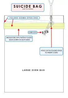 A suicide bag, also known as an exit bag or hood,[1][2] is part of a euthanasia device consisting of a large plastic bag with a drawcord used to commit suicide through inert gas asphyxiation. It is usually used in conjunction with a flow of an inert gas that is lighter or less dense than air, like helium or nitrogen, which prevents the panic, sense of suffocation and struggling before unconsciousness, known as the hypercapnic alarm response[3]: 45 caused by the presence of high carbon dioxide concentrations in the blood.[3] This method also makes the direct cause of death difficult to trace if the bag and gas canister are removed before the death is investigated. While asphyxiation by helium can be detected at autopsy, there is currently no test that can detect asphyxiation by nitrogen. For this reason, nitrogen is commonly the preferred choice for people who do not want the cause of death established.[4][5][6]