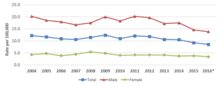 On average, adjusted for age, The Central Statistics Office provided the overall suicide rate has a decreasing trend, which is from 13.5 per 100,000 population in 2001 to 8.5 in 2016 (The National Suicide Research Foundation, 2016).