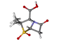 Sulbactam is primarily used as a suicide inhibitor of β-lactamase, shielding more potent beta-lactams such as ampicillin.[6] Sulbactam itself contains a beta-lactam ring, and has weak antibacterial activity by inhibiting penicillin binding proteins (PBP) 1 and 3, but not 2.[7]