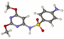 Sulfadimethoxine (or sulphadimethoxine, trade names Di-Methox or Albon) is a long-lasting sulfonamide antimicrobial medication used in veterinary medicine. It is used to treat many infections, including respiratory, urinary tract, enteric, and soft tissue infections[3] and can be given as a standalone or combined with ormetoprim to broaden the target range.[2] Like all sulfamides, sulfadimethoxine inhibits bacterial synthesis of folic acid by acting as a competitive inhibitor against PABA. It is the most common drug prescribed to dogs who have coccidiosis.[4]