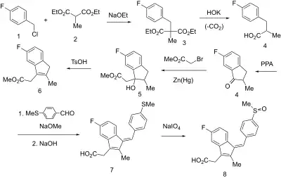 - Shuman RF, Pines SH, Shearin WE, Czaja RF, Abramson NL, Tull R (1977). "A sterically efficient synthesis of (Z)-5-fluoro-2-methyl-1-(p-methylthiobenzylidene)-3-indenylacetic acid and its S-oxide, sulindac". The Journal of Organic Chemistry. 42 (11): 1914–1919. doi:10.1021/jo00431a019.