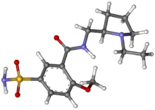 Sulpiride, sold under the brand name Dogmatil among others, is an atypical antipsychotic (although some texts have referred to it as a typical antipsychotic)[9] medication of the benzamide class which is used mainly in the treatment of psychosis associated with schizophrenia and major depressive disorder, and sometimes used in low dosage to treat anxiety and mild depression. Sulpiride is commonly used in Asia, Central America, Europe, South Africa and South America. Levosulpiride is its purified levo-isomer and is sold in India for similar purpose. It is not approved in the United States, Canada, or Australia. The drug is chemically and clinically similar to amisulpride.