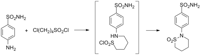 Sulfanilamide can be reacted with ω-chlorobutylsulfonyl chloride and aqueous sodium carbonate to form the presumed intermediate (middle), which spontaneously cyclizes to give the drug.