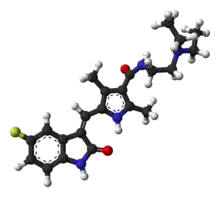 Sunitinib, sold under the brand name Sutent, is an anti-cancer medication.[2] It is a small-molecule, multi-targeted receptor tyrosine kinase (RTK) inhibitor that was approved by the FDA for the treatment of renal cell carcinoma (RCC) and imatinib-resistant gastrointestinal stromal tumor (GIST) in January 2006. Sunitinib was the first cancer drug simultaneously approved for two different indications.[3]