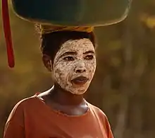 Malagasy woman from Madagascar wearing masonjoany, a traditional sunscreen whose use dates back to the 18th century
