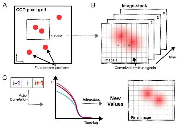 SOFI has been developed for super-resolution of biological specimen that are labelled with independently fluctuating fluorescent emitters (organic dyes, fluorescent proteins). In comparison to other super-resolution microscopy techniques such as STORM or PALM that rely on single-molecule localization and hence only allow one active molecule per diffraction-limited area (DLA) and timepoint,[1][2] SOFI does not necessitate a controlled photoswitching and/ or photoactivation as well as long imaging times.[3][4] Nevertheless, it still requires fluorophores that are cycling through two distinguishable states, either real on-/off-states or states with different fluorescence intensities. In mathematical terms SOFI-imaging relies on the calculation of cumulants, for what two distinguishable ways exist. For one thing an image can be calculated via auto-cumulants[3] that by definition only rely on the information of each pixel itself, and for another thing an improved method utilizes the information of different pixels via the calculation of cross-cumulants.[5] Both methods can increase the final image resolution significantly although the cumulant calculation has its limitations. Actually SOFI is able to increase the resolution in all three dimensions.[3]