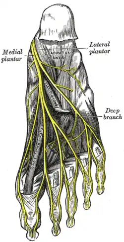 - the 4th common plantar digital nerve communicates with the third common plantar digital branch of the medial plantar nerve and divides into two proper digital nerves, which supply the adjoining sides of the fourth and fifth toes. The 4th common plantar digital nerve also has a branch that supplies the interosseus muscles of the 4th intermetatarsal space.
