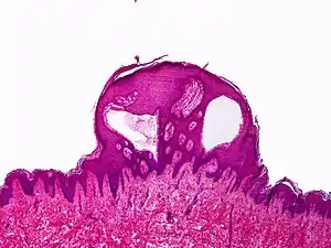 | Lymphangioma circumscriptum; only stratum papillare is affected. | |
