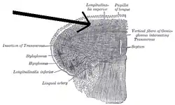 The superior longitudinal muscle of the tongue is one of the intrinsic muscles of the tongue.[1] It arises from the submucous fibrous layer close to the epiglottis and from the median fibrous septum, and runs forward to the edges of the tongue.