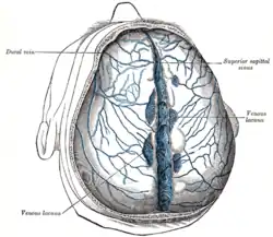 ![]() Dural veins (superior sagittal sinus at top, labeled "sin. sagittalis sup." for Latin sinus sagittalis superior) | |