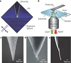 Schematic depictions and images of commonly used metallic nanoprobes that can be used to see a sample in nanometer resolution. Notice that the tips of the three nanoprobes are 100 nanometers.[4]