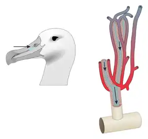 The supraorbital gland is a type of lateral nasal gland found in some species of marine birds, particularly penguins, which removes sodium chloride from the bloodstream. The gland's function is similar to that of the kidneys, though it is much more efficient at removing salt, allowing penguins to survive without access to fresh water. The supraorbital gland is also possessed by the European herring gull - allowing the seagull to drink seawater without becoming ill, although it prefers to drink fresh water when available.[1] Contrary to popular belief, the gland does not directly convert saltwater to freshwater. The term supraorbital refers to the area just above the eye socket (which is known as the orbit).