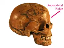 Some paleoanthropologists distinguish between frontal torus and supraorbital ridge.[2] In anatomy, a torus is a projecting shelf of bone that unlike a ridge is rectilinear, unbroken and goes through glabella.[3] Some fossil hominins, in this use of the word, have the frontal torus,[4] but almost all modern humans only have the ridge.[5]