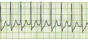 The main pumping chamber, the ventricle, is protected (to a certain extent) against excessively high rates arising from the supraventricular areas by a "gating mechanism" at the atrioventricular node,[13] which allows only a proportion of the fast impulses to pass through to the ventricles. An accessory "bypass tract" can avoid the AV node and its protection so that the fast rate may be directly transmitted to the ventricles. This situation has characteristic findings on ECG.[14] A congenital heart lesion, Ebstein's anomaly, is most commonly associated with supraventricular tachycardia.