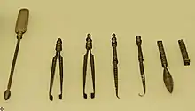 Pharyngeal forceps were made of fishbones and they were used to remove entities from the pharynx.[31] Varix extractors were a type of forceps used to extract varicose veins, which is a medical condition characterized by abnormally large veins.[32] This procedure would be conducted by mapping out the locations of the afflicted veins, then the skin would be held and divided. Following this the extractor would hold and cut the skin, allowing for the veins to be removed.[33] Tooth and stump forceps were used to extract teeth. This operation, and hence these tools were rarely employed due to how dangerous the operation was.[34]