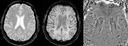 Gradient recalled echo (GRE) imaging is the conventional way to detect hemorrhage in CAA, however SWI is a much more sensitive technique that can reveal many micro-hemorrhages that are missed on GRE images.[7] A conventional gradient echo T2*-weighted image (left, TE=20 ms) shows some low-signal foci associated with CAA. On the other hand, an SWI image (center, with a resolution of 0.5 mm x 0.5 mm x 2.0 mm, projected over 8mm) shows many more associated low-signal foci. Phase images were used to enhance the effect of the local hemosiderin build-up. An example phase image (right) with yet higher resolution of 0.25 mm x 0.25 mm x 2.0 mm shows a clear ability to localize multiple CAA-associated foci.