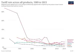 This target has one Indicator: Indicator 17.12.1 is the "Weighted average tariffs faced by developing countries, least developed countries and small island developing States".[7]
