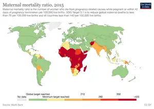 Target 3.1 aims to reduce maternal mortality to less than 70 deaths per 100,000 live births.[10] Though the maternal mortality ratio declined by 37 percent between 2000 and 2015, there were approximately 303,000 maternal deaths worldwide in 2015, most from preventable causes.[5] In 2015, maternal health conditions were also the leading cause of death among girls aged 15–19.[5] Key strategies for meeting SDG 3 will be to reduce adolescent pregnancy (which is strongly linked to gender equality), provide better data for all women and girls, and achieve universal coverage of skilled birth attendants.[5]: 34