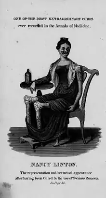 Swaim used a symbol of Hercules killing the Hydra in early advertisements of his product, which was being bottled in rectangular bottles by 1825, and in green cylindrical bottles by 1829.[12] Swaim advertised heavily, and took advantage of developments in commercial lithography in the 1830s to advertise his concoction with a portrait of a woman named Nancy Linton, advertising her "actual appearance" after being cured, although this appearance still looks rather gruesome to modern eyes. The panacea contained mercury, and Linton's appearance appears to reflect signs of mercury poisoning.[13] Mercuric chloride (called corrosive sublimate at the time) did have a prior history of being used to treat syphilis. Oil of wintergreen and sarsaparilla were prominent ingredients of Swaim's product.[14]