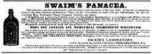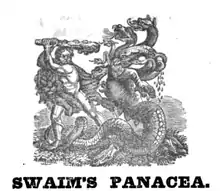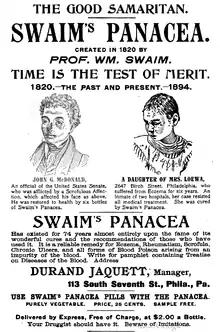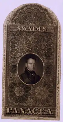 Swaim's Panacea (also called Swaim's Celebrated Panacea) was an American patent medicine sold by William Swaim (1781–1846)[2] of Philadelphia, starting in approximately 1820, with formulations still being sold into at least the 1920s. It was advertised to cure various diseases including scrofula, mercurial disease, deep-seated syphilis, rheumatism, sores, swellings, etc.[3][4]