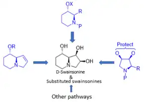Despite the small size of swaisonine, the synthesis of this molecule and its analogues is quite challenging due to the presence of four chiral centers. In most cases, synthesis implies the use of sugars, chiral aminoacids as starting compounds, or chiral catalysts to induce chirality.The swainsonine synthesis was systemazed by three common precursors: 8-oxy-hexahydroindolizines, N-protected-3-oxy-2-substituted-piperidines and 2-substituted-pyrrolidine-3,4-protected-diols.[13]