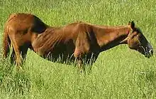 Usually called "swayback", soft back, or low back, an excessive downward bend in the back is an undesirable conformation trait. Swayback is caused in part from a loss of muscle tone in both the back and abdominal muscles, plus a weakening and stretching of the ligaments. As in humans, it may be influenced by bearing young; it is sometimes seen in a broodmare that has had multiple foals. However, it is also common in older horses whose age leads to loss of muscle tone and stretched ligaments. It also occurs due to overuse or injury to the muscles and ligaments from excess work or loads, or from premature work placed upon an immature animal. Equines with too long a back are more prone to the condition than those with a short back, but as a longer back is also linked to smoother gaits, the trait is sometimes encouraged by selective breeding. It has been found to have a hereditary basis in the American Saddlebred breed, transmitted via a recessive gene.[1] Research into the genetics underlying the condition has several values beyond just the Saddlebred breed as it may "serve as a model for investigating congenital skeletal deformities in horses and other species."[4]