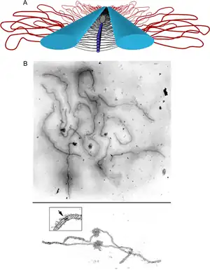 The synaptonemal complex was described by Montrose J. Moses in 1956 in primary spermatocytes of crayfish and by D. Fawcett in spermatocytes of pigeon, cat and man.[4] As seen with the electron microscope, the synaptonemal complex is formed by two "lateral elements", mainly formed by SYCP3 and secondarily by SYCP2, a "central element" that contains at least two additional proteins and the amino terminal region of SYCP1, and a "central region" spanned between the two lateral elements, that contains the "transverse filaments" composed mainly by the protein SYCP1.[3]