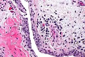 Synovitis may occur in association with arthritis as well as lupus, gout, and other conditions. Synovitis is more commonly found in rheumatoid arthritis than in other forms of arthritis, and can thus serve as a distinguishing factor, although it is also present in many joints affected with osteoarthritis.[1][2] In rheumatoid arthritis, the fibroblast-like synoviocytes, highly specialized mesenchymal cells found in the synovial membrane, play an active and prominent role in the synovitis.[3] Long term occurrence of synovitis can result in degeneration of the joint.